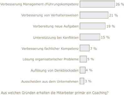 Lange Zeit war Coaching vornehmlich Führungskräften vorbehalten. Auch heute steht noch die Verbesserung der Management- und Führungskompetenz bei 26 Prozent der Unternehmen im Mittelpunkt des Interesses. Die Verbesserung von Verhaltensweisen und die Vorbereitung auf neue Aufgaben folgen mit 21 Prozent bzw. 19 Prozent.