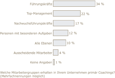 Obwohl Coaching weiterhin das den Führungskräften vorbehaltene Instrument der Personalentwicklung bleibt, wollen immerhin 14 Prozent (2005: 10 Prozent) der Unternehmen Coachings über alle Hierarchieebenen hinweg einsetzen. 18 Prozent der Unternehmen sprechen sich allerdings dafür aus, Personen mit besonderen Aufgaben verstärkt Coachings zukommen zu lassen. 2005 waren dies nur 11 Prozent.