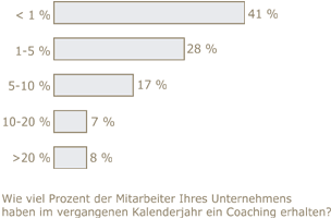 Nur 10 Prozent der Unternehmen beziehen alle Hierarchieebenen in ihre Coaching-Programme mit ein, wobei kein wesentlicher Unterschied abhängig von der Größe des Unternehmens feststellbar ist. Führungskräfte bleiben die bevorzugte Zielgruppe von Coachings. 73 Prozent der Coachings konzentrieren sich auf die obersten Führungsebenen. Somit ist es auch keine Überraschung, dass in 41 Prozent der Unternehmen weniger als ein Prozent der Mitarbeiter in den Genuss eines Coachings kommen. Trotzdem Coaching also seit geraumer Zeit in aller Munde ist, bleibt es zumindest bezüglich der involvierten Mitarbeiter eine Premium-Form der Mitarbeiterentwicklung.