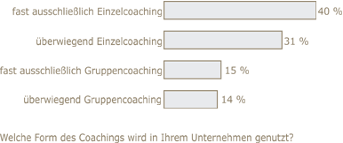 Da Coaching ein Thema ist, das nach wie vor besonders vertraulich behandelt wird, verwundert es nicht, dass 71 Prozent der Coachings fast ausschließlich bzw. überwiegend als Einzelcoachings durchgeführt werden.