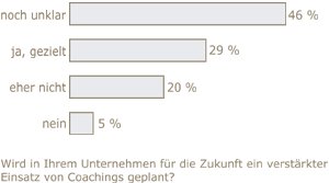 Coaching wird auch in Zukunft ein wichtiges Thema in der Personalentwicklung sein. Lediglich 25 Prozent der Unternehmen stehen einem verstärkten Einsatz von Coachings skeptisch gegenüber. Als Grund wird u.a. die bereits hohe Quote der Coachings genannt, so dass ein noch stärkerer Einsatz nicht mehr zweckdienlich sei.