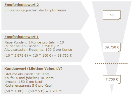 Der Recommendation Value 1 setzt sich analog aus dem Umsatz der neuen Kunden sowie aus Kostenersparnissen zusammen. Gehen wir davon aus, dass unser loyaler Kunde pro Jahr nur einen einzigen neuen Kunden gewinnt und jeder neue Kunde im Durchschnitt den halben Lifetime Value aufweist, so ergibt das inklusive einer Akquisekosten-Ersparnis von 100 Euro pro Kunde nach zehn Jahren insgesamt 39.750 Euro.