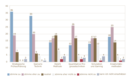 Obiger Abbildung ist zu entnehmen, dass die häufigsten Anwendungs-Methoden in Unternehmen die Strategische Frühaufklärung und die Szenario Technik sind, dicht gefolgt von den quantitativen Prognose- und den Kreativitätstechniken.