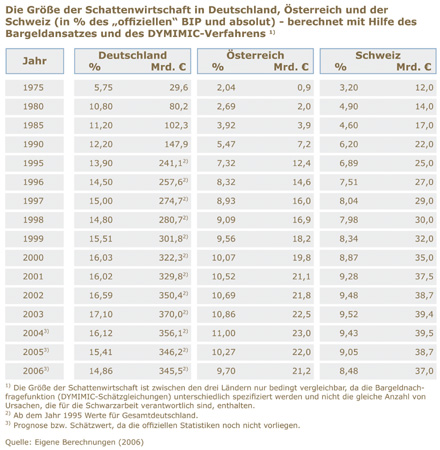 ährend in vielen Ländern auf den offiziellen Arbeitsmärkten die Arbeitslosigkeit erheblich ist, existieren außerhalb der offiziellen Wirtschaft gleichzeitig in beträchtlichem Maße Beschäftigungsmöglichkeiten. Vor diesem Hintergrund werden das Ausmaß und die zeitliche Entwicklung der Schattenwirtschaft heutzutage gerade auch in Deutschland, Österreich und der Schweiz intensiv und kontrovers diskutiert. Darüber hinaus wird über Möglichkeiten nachgedacht, wie man die schattenwirtschaftlichen Aktivitäten in die offizielle Wirtschaft überführen kann. Der vorliegende Beitrag informiert über die Entwicklung der Schattenwirtschaft in den drei deutschsprachigen Ländern seit 1975, gibt eine Prognose für das Jahr 2006 und einen kurzen Ausblick auf das Jahr 2007.
