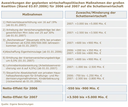 Während die Koalitionsbeschlüsse im Jahr 2006 einen moderaten Rückgang der Schattenwirtschaft bewirken, ist nach heutigem Kenntnisstand für das Jahr 2007 somit insgesamt eine deutliche Zunahme der Schattenwirtschaft zwischen 3.500 und 5.000 Mio. Euro zu erwarten, d.h. der rückläufige Trend in der Schattenwirtschaft wird aller Voraussicht nach beendet sein.