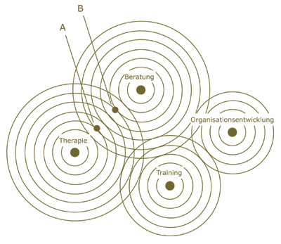 Abbildung 2: topographische Darstellung sich überlappender kernprägnanter Definitionen (Beispiel) (A = Übertragung in Therapie; B = Arbeit mit Gesunden in Beratung)